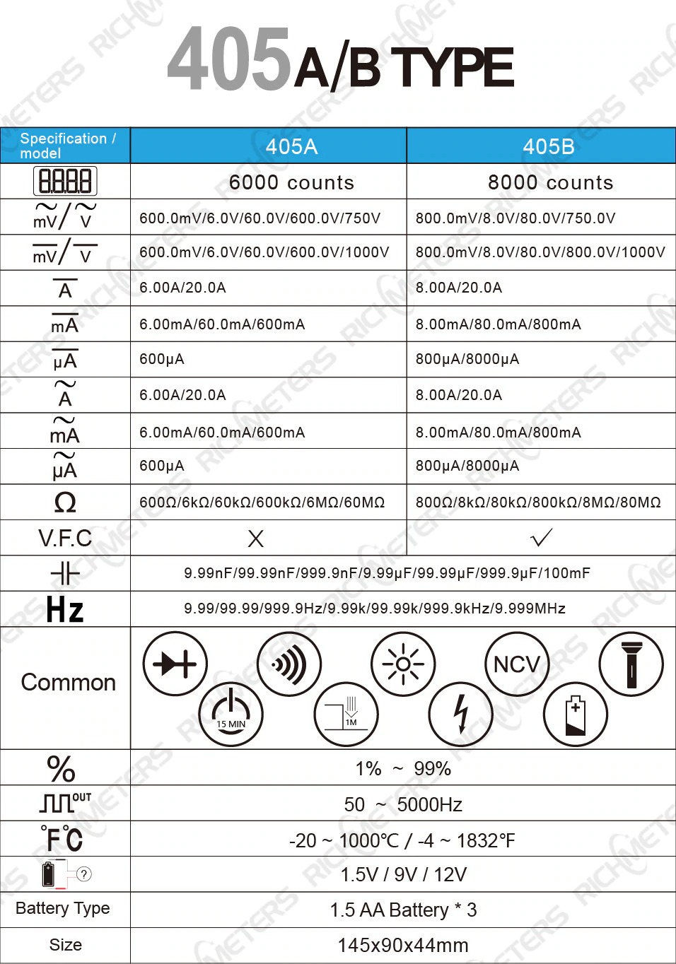 Цифровой мультиметр RICHMETERS 405B True-RMS имеет шкалу с 8000 отсчетов, измеряет постоянное и перемененное напряжение и ток, сопротивление, емкость, частоту, температуру, имеет встроенный генератор прямоугольного сигнала, функцию бесконтактного обнаружения напряжения (NVC), аналоговую шкалу, фонарик.